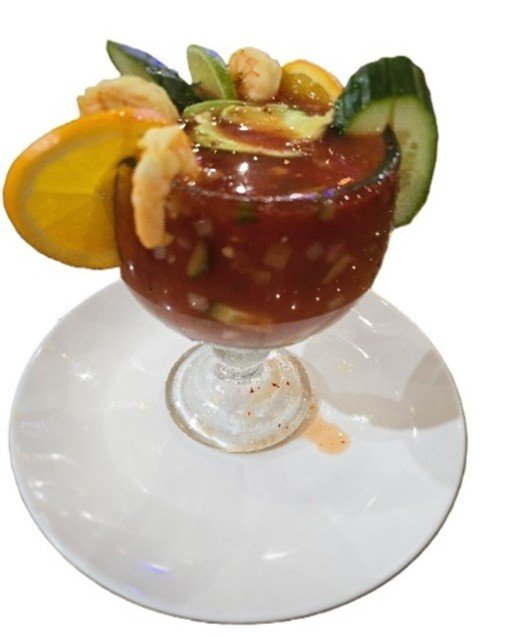 Chilled shrimp swimming in a margarita glass of our special sauce mixed with avocados cucumber and Pico Choice of tostada or saltine crackers