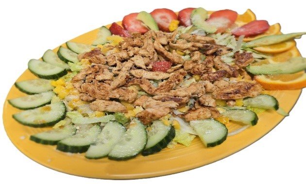 fresh lettuce avocados Black beans tomato onions peppers parmesan shredded cheese Choice of steak or grilled chicken