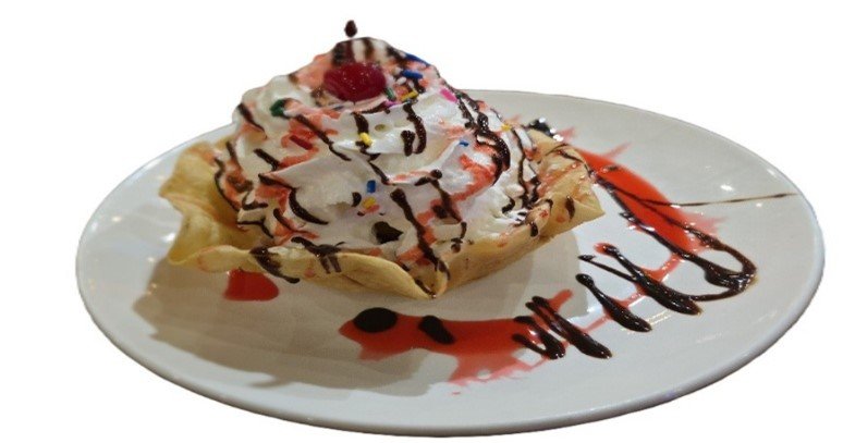 A crispy flour tortilla with shredded beef shredded chicken or ground beef topped with lettuce tomatoes cheese and sour cream