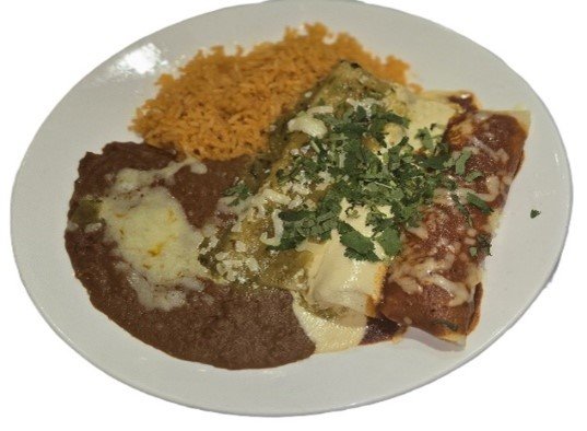 3 enchiladas; 1 steak, 1 grilled chicken, and 1 carnitas. Topped with cilantro, green, red and cheese sauce. Served with rice and beans.
