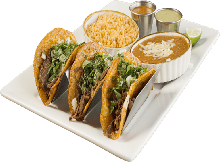 These tacos are made with yellow corn tortillas, stuffed with cilantro and raw onions. Served with rice, beans, grilled onions, limes, chiles toreadors, and taco sauce. Please select your choice of meat.